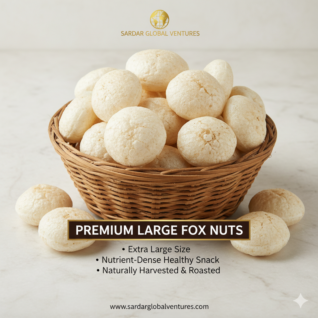Snack healthy with Sardar Global Fox Nuts (Makhana) — light, crunchy, and naturally nutritious. Packed with protein, antioxidants, and essential minerals, these premium-quality fox nuts are perfect for roasting, adding to curries, or enjoying as a guilt-free snack. Hygienically processed and carefully packed, they retain freshness, crunch, and natural flavor for a wholesome eating experience.
